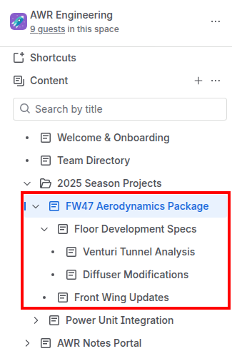 The image below shows a sample subtree of confidential information. The four pages beneath the FW47 Aerodynamics Package page must be accessible only on a need-to-know basis: